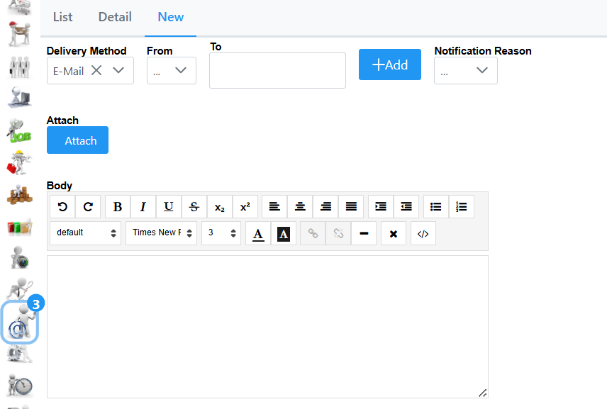 To add a new communication navigate to the New tab. Delivery method has 2 options either e-mail or Cell Phone. From will list the accounts currently set up in your system. In the To field you can type first few characters to bring up the names you would like to select, if the contact is not in the list, you can click the Add button and add the contact accordingly. Notification Reason gives to 6 templates to choose from which has been pre-defined on the system. You can attach a file by hitting the Attach Button. In the Body field you can type necessary information. A Send button will appear which enables you to send it.