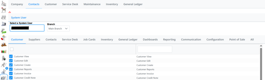 Select Contacts, System User, type first few characters in System user field and select contact, and select correct branch if more than one. The following screen will be displayed listing all the tabs where access can be specified.