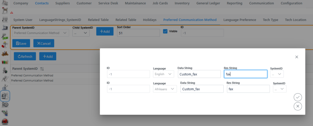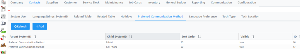 This tab lists the communication methods setup in the system.