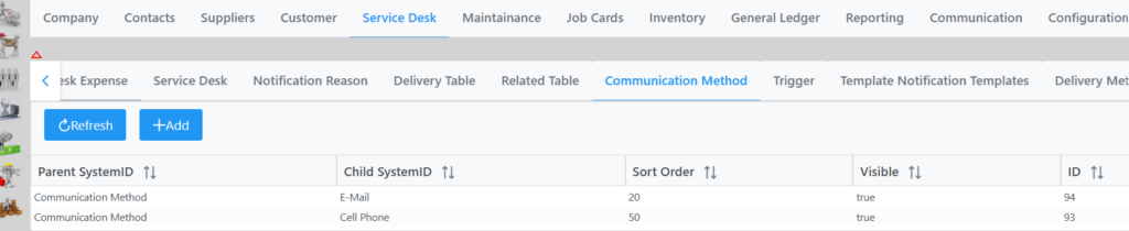 Selecting Communication Method tab lists which methods are setup in the system as seen in following screen.