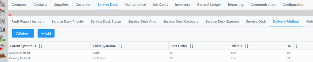 Selecting delivery method brings up the following window listing the methods setup in the system.