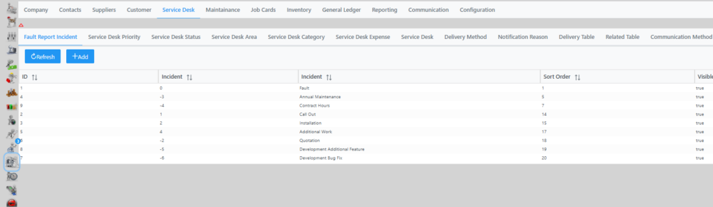 Service Desk Fault Report Incident lists the following screen showing all types of calls.