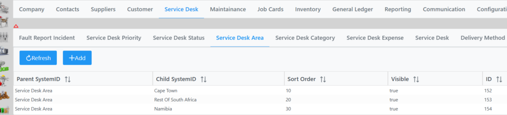Selecting Service Desk Area will display the following 3 areas setup in the system.