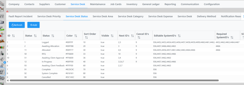 Service Desk Status lists all statuses setup in the system as per following screen.