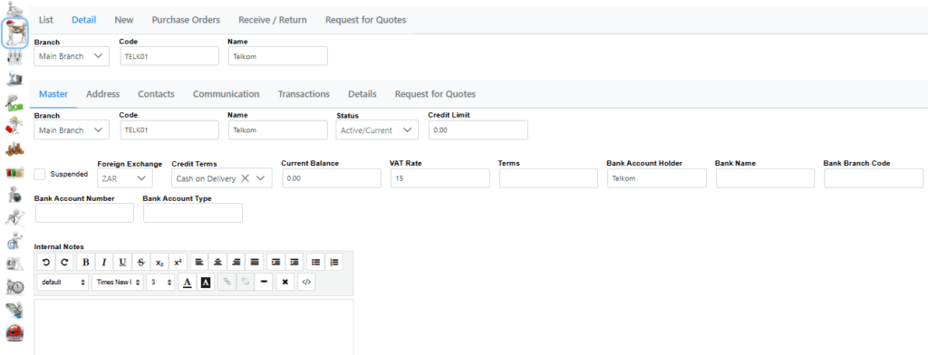 Master shows all details which can be captured for supplier, including an Internal Notes section for more details.