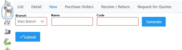 The New tab allows you to add additional suppliers. If you only have one branch or access to one branch it will be selected for you. Supplier name should be the name of the supplier that will be used for purchase orders and request for quotations. You can enter a unique Supplier Code or click Generate for the system to propose a unique one.