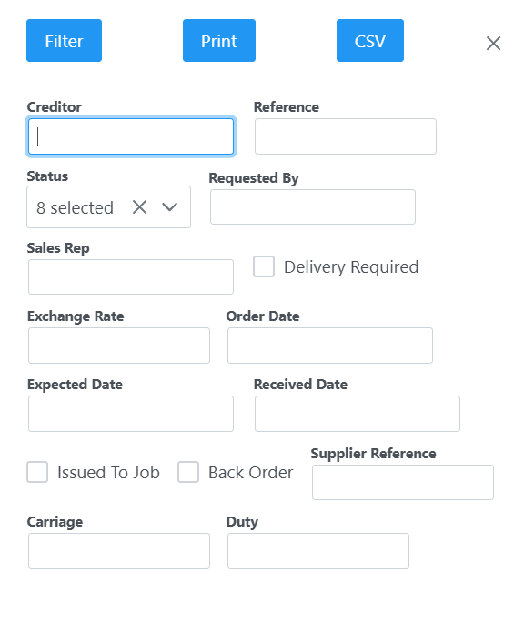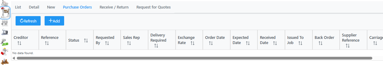 Filling in the key words and hitting filter will bring up any Purchase Orders related to the filter. Or select Add to create a new Purchase Order.