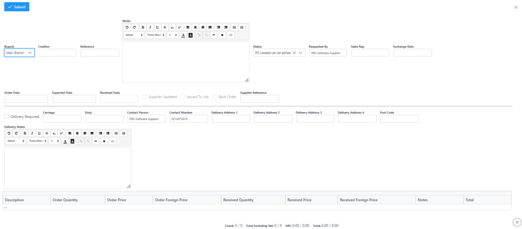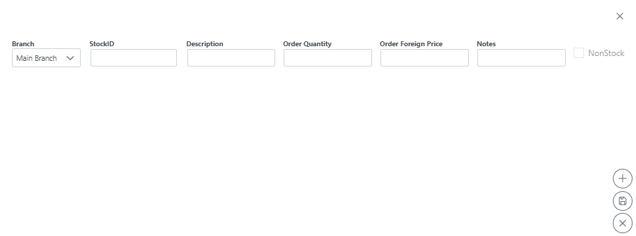 By typing first few characters of a stock item in the StockID field, a list of items will show which you can select, once selected you can alter the description, set quantity and price. Notes can also be utilized. Once details are captured, click the + sign to add item to the order. If more items need to be added, follow same procedure. Once all items are added, click save to save the changes to your order. If all information is correct on the Purchase Order, click Submit on top left corner.