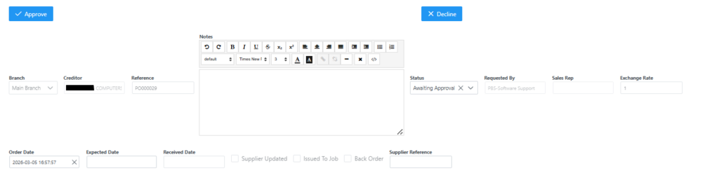 Here the Purchase Order can either be Approved or Declined if you have been given authority to do so. On clicking Approve, the Purchase Order will now go into the printing faze as seen in next screen.