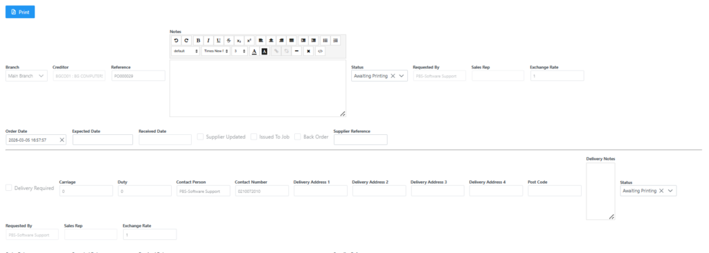 You will see the Status has now changed to Awaiting Printing. Click the print button and the Purchase Order will open for you to print or save.