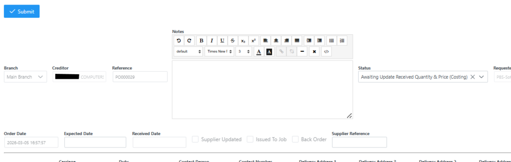 The Purchase Order will then go into the Submit faze and status updated to Awaiting Update Received Quantity & Price (Costing) as seen in next screen.