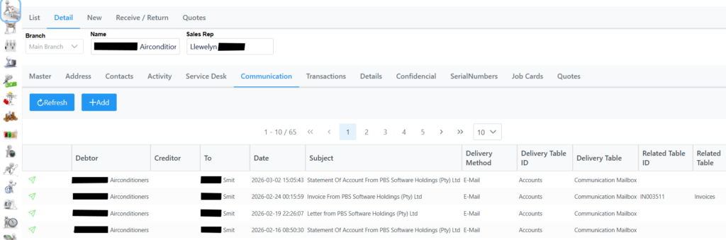 Communication shows all communication related to the Customer and also what type of communication. Use the drop down button to expand the list accordingly.