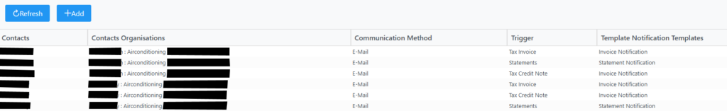 The following tab is where you setup the notification templates. Only if a contact is associated with this debtor will you be able to add it here to receive Tax Invoice, Statement or Tax Credit Note.