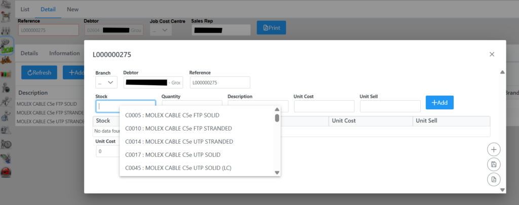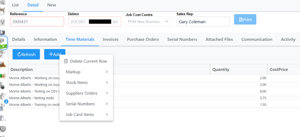 The top heading shows details such as the Job Card number, the Debtor, Job Cost Centre and also the Sales Rep.