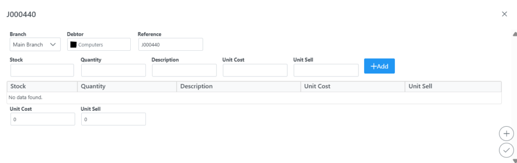 Selecting Stock Items Issue to Job Card from stock will bring up the following window where you can type the first few characters in the Stock field to bring up a list. Once item is selected and quantity specified click Add. If more stock needs to be added follow the same procedure. Once all items have been added you can click the Save button and Submit.