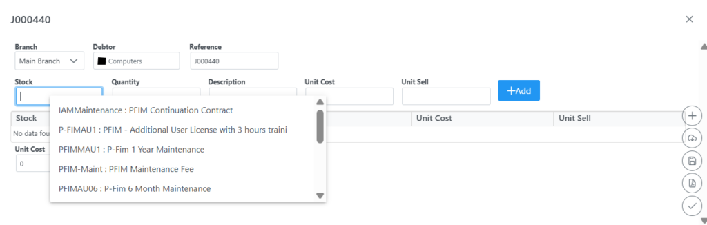 The Time Materials tab is where goods are allocated to the Job Card, couple of options are available. By selecting the Add button the following screen is shown.
