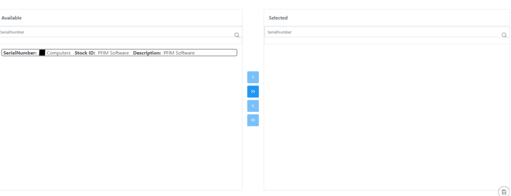 Selecting Serial Numbers Add Units to Job Card will bring up the following screen where a serial number(s) already created in the Customer can be added. Select from the left window and drag to the right, remove a serial number by selecting from the right window and dragging it to the left. Remember to click the save button.