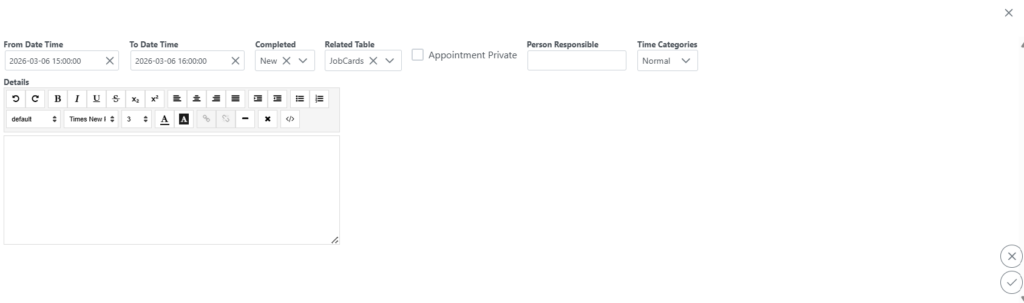 Here specify the From and To date, the Person Responsible by typing the first few characters in the list, and the Time Category. Time Categories are Normal, Overtime, Sunday and Public Holiday which rates are already pre-set in the system. Selecting the Appointment Private tick box will make the details private so only you and your manager/HR will be able to see it e.g. having a DR’s Appointment and so on. Input necessary details in the Details windows, remember to click submit to save changes.