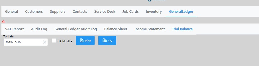 You can then print the trial balance or export to a csv formatted file.